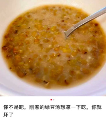 绿豆汤煮好后的温度高达100摄氏度,等到浓稠的绿豆汤降到适宜温度,又因为它营养丰富、pH值又比较高,在喝之前,已经给了大量的时机让微生物“钻”进去“搞破坏”了。
